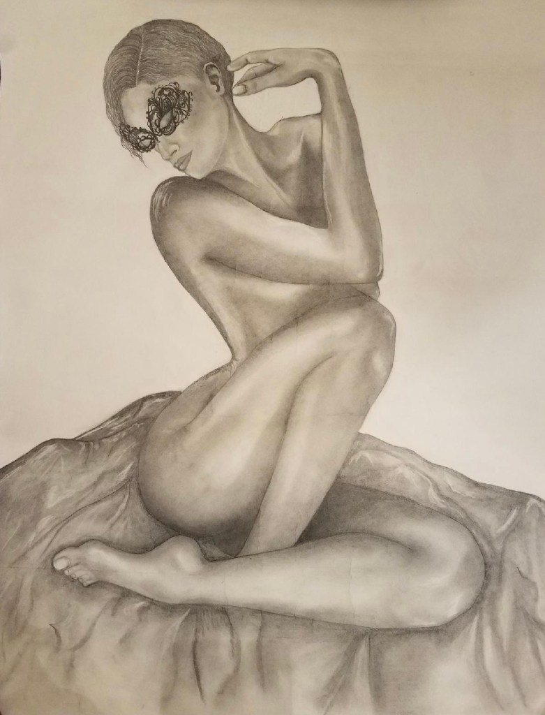 Masked Figure, Anna Huerta, Graphite on Paper, 24″ x 30″, 2020