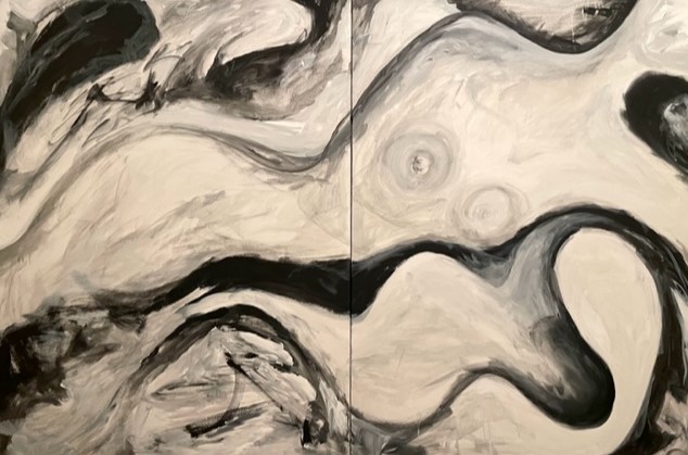 Woman Adrift, Anna Huerta, Two Panels, 24″ x 36″ each, Acrylic on Canvas, 2024.